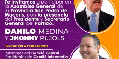 Danilo Medina y Johnny Pujols, Presidente y Secretario General del PLD encabezan este sábado asamblea de dirigentes en San Pedro de Macorís