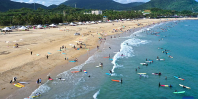 Turistas surfean en la bahía de Riyue en Wanning, Hainan
