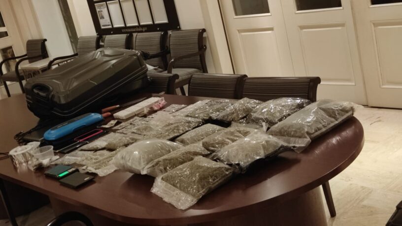 Al momento de su detención al imputado se le ocuparon en el closet de la habitación principal, 14 paquetes de marihuana en una maleta, varias porciones y semillas del vegetal en fundas plásticas, 20 cartuchos, cuatro celulares, una laptop, un rollo de cinta adhesiva, una máquina de empaque al vacío, armas blancas, una balanza, entre otras evidencias.