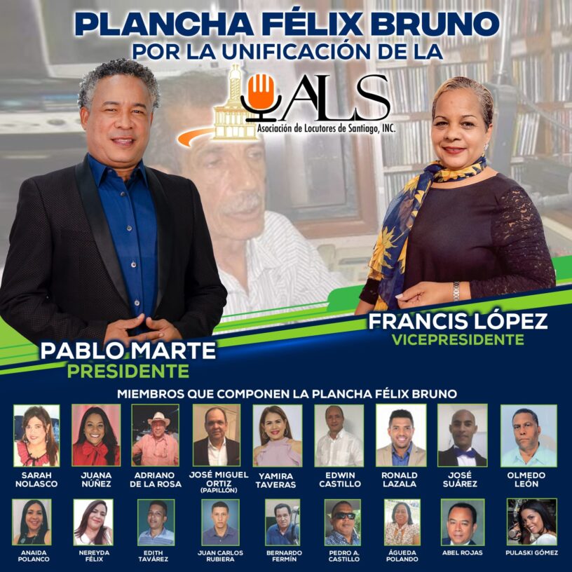 Santiago.-El reconocido y meritorio locutor de la ciudad de Santiago, Pablo Marte (Negro Peter) tiene previsto buscar nueva vez este viernes la presidencia de la prestigiosa Asociación de Locutores de Santiago (ALS), encabezado la plancha nombra Félix Bruno, bajo el lema por “La Unificación de la ALS”.