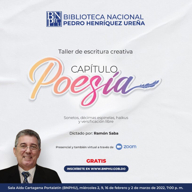 Santo Domingo, R. D., 30 de enero, 2021.- La Biblioteca Nacional Pedro Henríquez Ureña (BNPHU) impartirá el Taller de Escritura Creativa de Poesía, los miércoles 2, 9 y 16 de febrero y el 2 de marzo de este año, a partir de las 7:00 p. m.