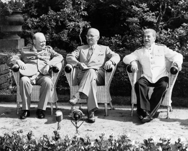 Winston Churchill, Harry Truman, y Joseph Stalin, (Reino Unido, Estados Unidos y Rusia ex Unión Soviética), durante una Conferencia de Prensa en 1945, Durante la Segunda Guerra Mundial, en la conformación de una Alianza para enfrentar a Adolf Hitler y Benito Mussolini (Alemania e Italia). Pero en esta ocasión Alemania e Italia están en la Alianza OTAN junto a los Estados Unidos y El Reino Unido. Y Rusia que fue un Aliado en el año194, en la Segunda Guerra Mundial, en este Conflicto con Ucrania esta Contra de la Alianza de 1945, aunque apoyado por una serie de Países afines con su causa, como China, Irán, Corea del Norte y otros ante cualquier escalada Mayor del conflicto, como la ocurrida en las: Primera y Segunda Guerra Mundial..