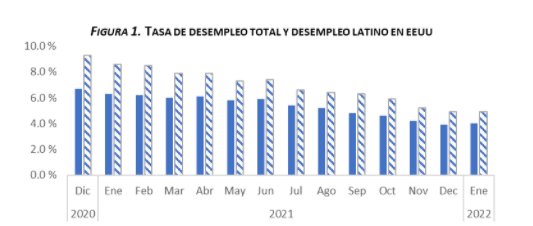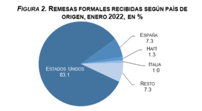 El ente emisor explica que las condiciones del mercado laboral de los Estados Unidos (EEUU) es uno de los principales factores que sigue incidiendo sobre el comportamiento de las remesas, ya que desde ese país provino el 83.1 % de los flujos de enero. Durante el mes de enero, la tasa de desempleo aumentó ligeramente a 4.0 %, de 3.9 % en diciembre de 2021. Particularmente, el desempleo de los hispanos en EEUU no sufrió cambios en enero, manteniéndose fijo en 4.9 por ciento. Este comportamiento del desempleo sugiere que el ingreso disponible destinado por todos quienes componen la diáspora a las remesas no aumentó. En consecuencia, para sostener los flujos al país, pueden haber accedido a sus ahorros para apoyar a sus familias, evidenciando nueva vez el férreo compromiso de la diáspora con su patria de origen.