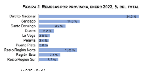 Respecto a la distribución de las remesas recibidas por provincias, el BCRD señala que el Distrito Nacional obtuvo la mayor proporción, un 34.2 %, seguido por las provincias Santiago y Santo Domingo, con un 14.0 % y 9.2 %, respectivamente. Esto indica que más de la mitad (57.4 %) de las remesas se recibe en las zonas metropolitanas del país.