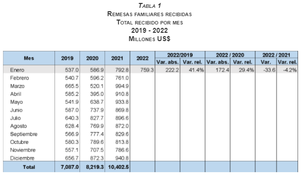 Tabla 1 Remesas familiares recibidas Total recibido por mes 2019 – 2022 Millones US$
