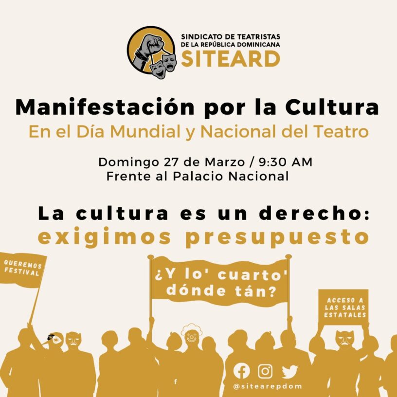 En ocasión de celebrarse el Día Mundial del Teatro, el Sindicato de Teatristas de la República Dominicana (SITEARD) convoca a su primera manifestación nacional este domingo 27 de marzo frente al Palacio Nacional a las 9:30 de la mañana.