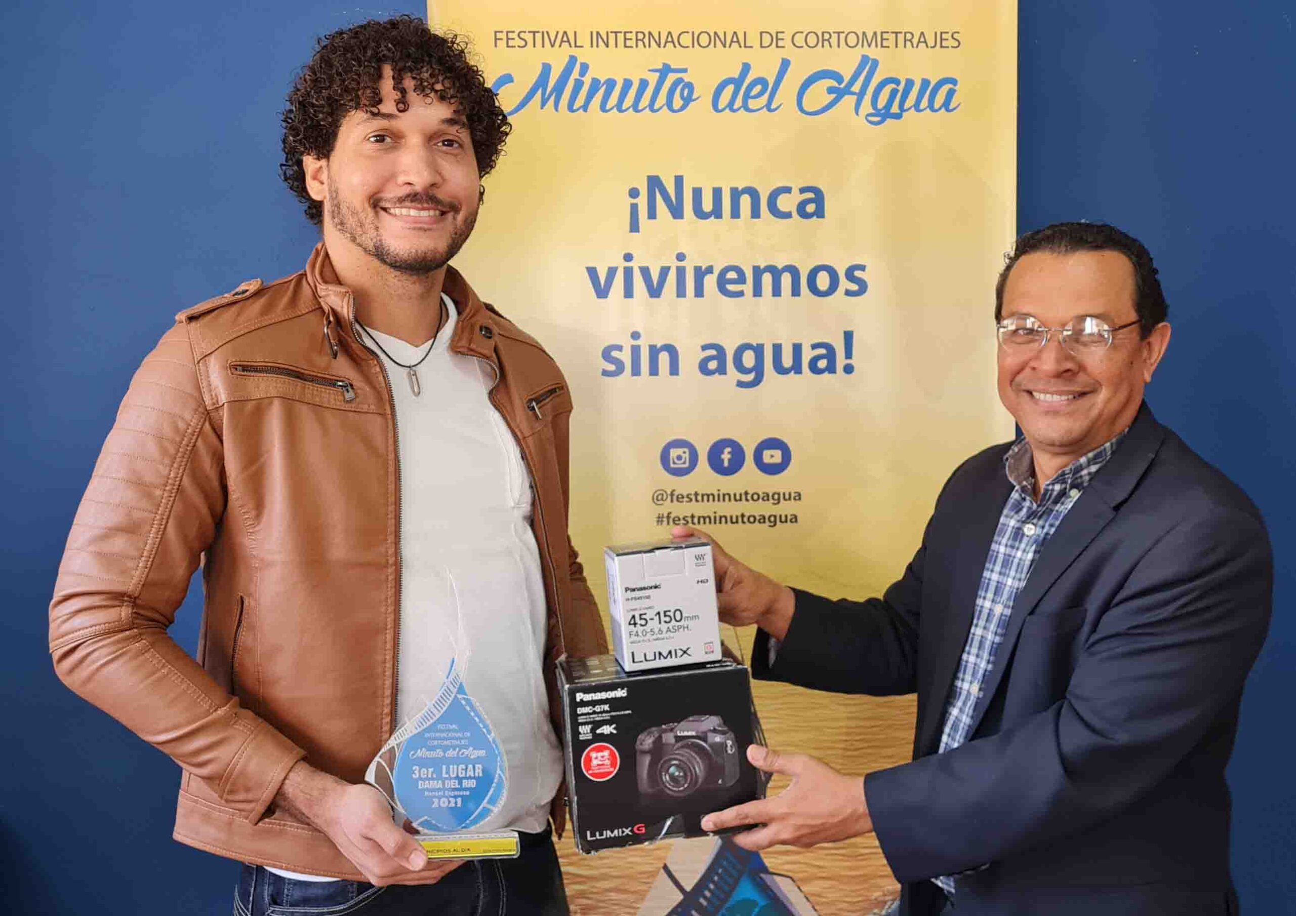 3. Hansel Espinosa, tercer lugar recibe su video kit de manos de Augusto Valdivia Tavárez, productor del Festival Minuto del Agua.