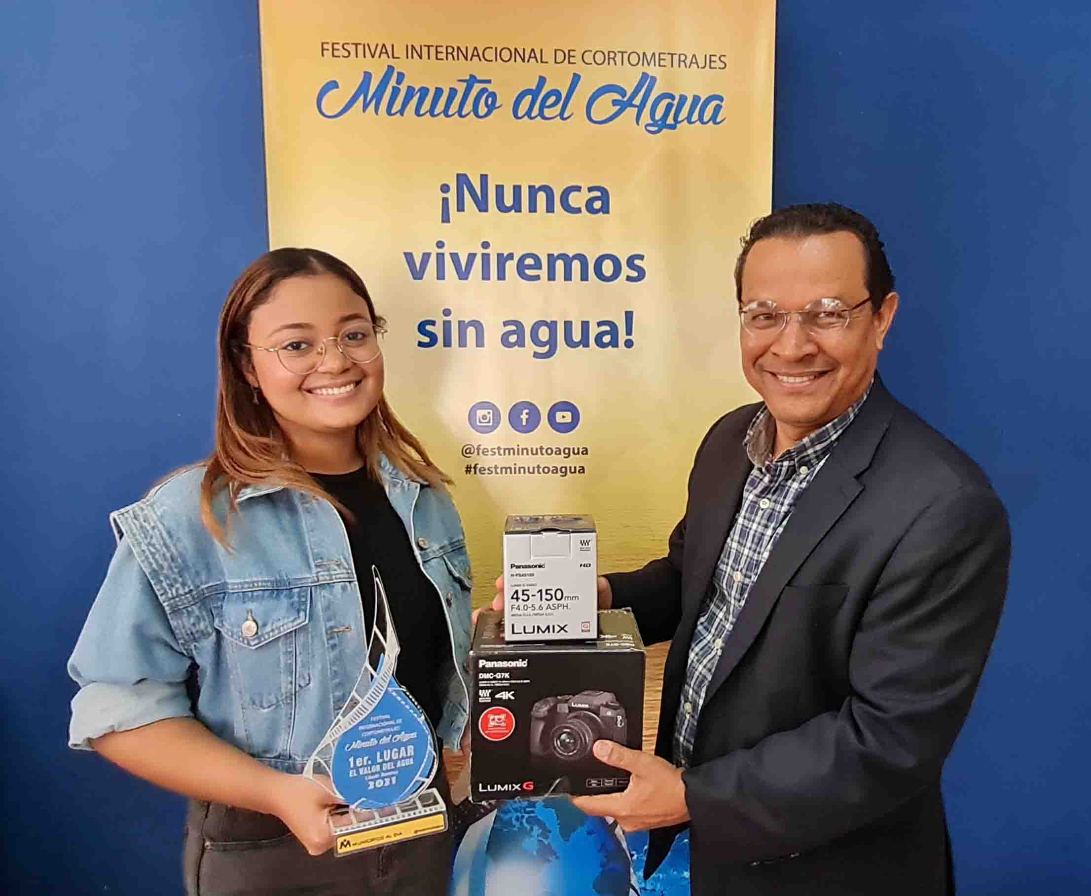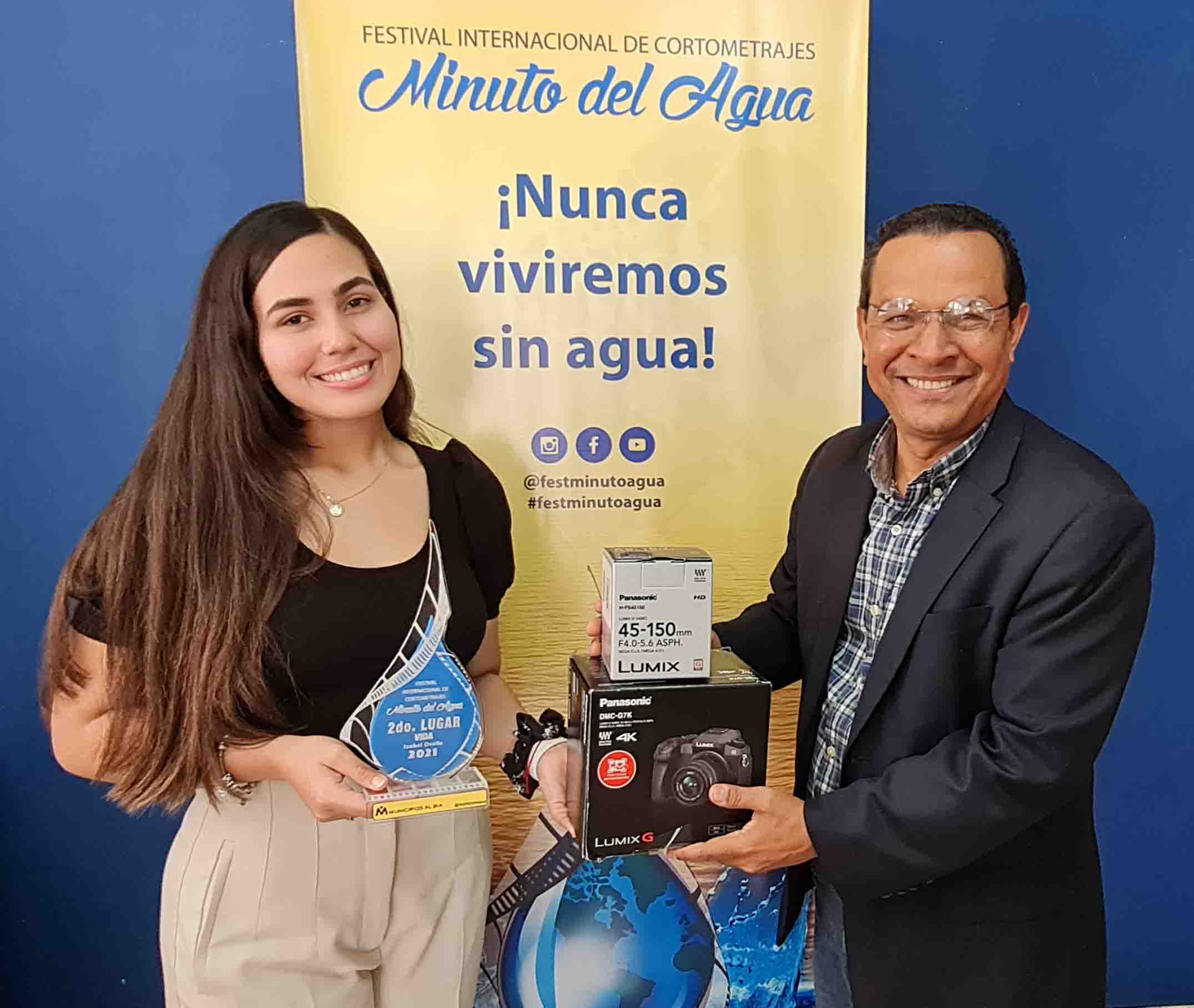 2. Isabel Ovalle, segundo lugar recibe su video kit de manos de Augusto Valdivia Tavárez, productor del Festival Minuto del Agua.