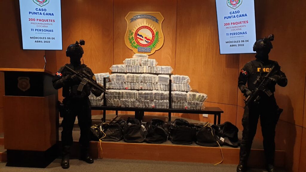 Santo Domingo, R. D., 6 de abril, 2022.- La Dirección Nacional de Control de Drogas (DNCD) con apoyo del Cuerpo Especializado de Seguridad Aeroportuaria, agencias de inteligencia del Estado y bajo la coordinación del Ministerio Público, incautaron 200 paquetes presumiblemente cocaína, en el interior de una aeronave en el Aeropuerto Internacional de Punta Cana, provincia La Altagracia.