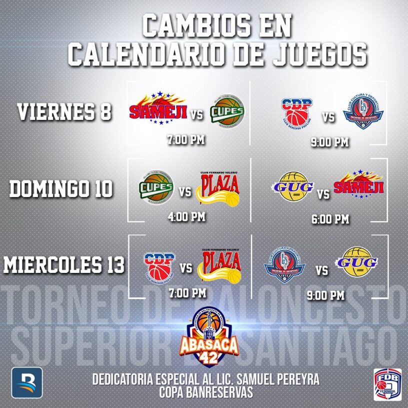 Santiago, RD.-El comité ejecutivo de la Asociación de Baloncesto de Santiago (ABASACA) notificó que los cambios en el calendario de la serie regular del Torneo 42 de Baloncesto Superior de Santiago solo se llevará a cabo en su última fecha prevista efectuarse el próximo miércoles 13 del presente mes, ya que la jornada de este viernes y la del domingo continuará como estaban previstas en el calendario principal