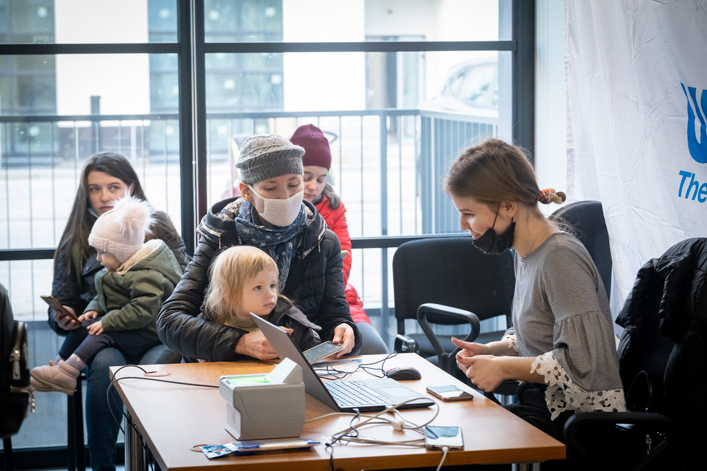 Una madre ucraniana con su hijo se registra en el centro de asistencia para recibir ayuda en efectivo de ACNUR en la capital de Polonia, Varsovia.
