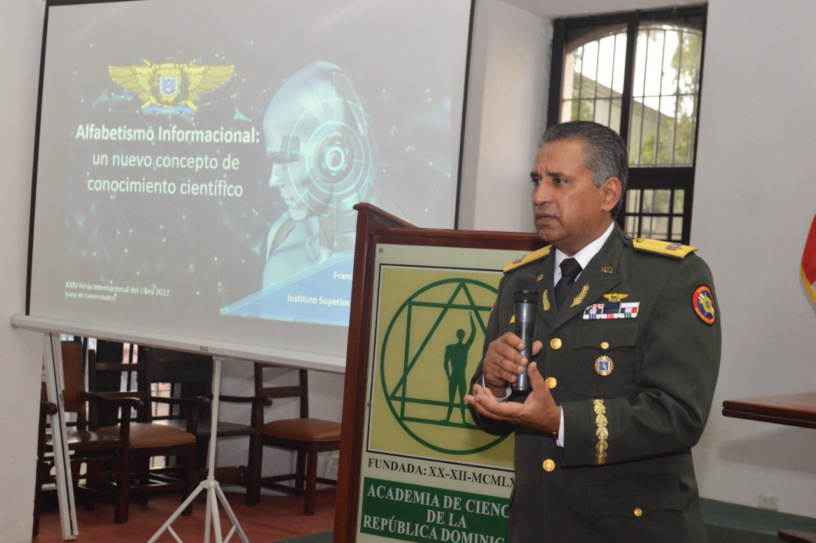 SANTO DOMINGO, RD.- La Academia de Ciencias sirvió de escenario para que el General de Brigada Francisco Ovalle Pichardo, Rector del Instituto Superior para la Defensa “General Juan Pablo Duarte y Díez” (INSUDE), impartiera la conferencia: “Alfabetismo Informacional: un nuevo concepto del conocimiento científico”, en el marco de la celebración de la XXIV Feria Internacional del Libro Santo Domingo 2022.