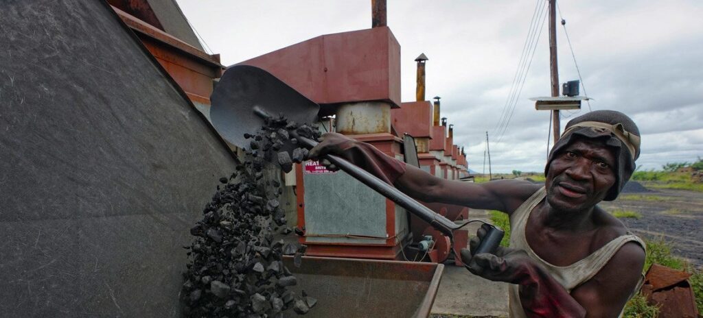 Un trabajador llena de carbón una caldera en una empresa de producción de tabaco en Malawi
