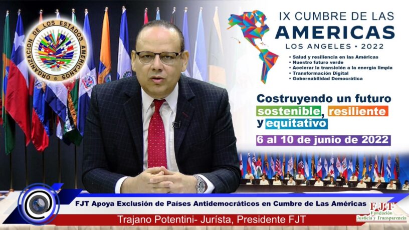 Santo Domingo, Rep. Dom., 04 de junio del 2022.- La Fundación Justicia y Transparencia (FJT), expresó su apoyo la exclusión y no invitación de Cuba, Venezuela y Nicaragua, de la IX Cumbre de las Américas a celebrarse del 6 A 10 de junio en Los Ángeles, California, por tratarse de países, que no cumplen con los requisitos indispensables, de haber logrado el poder en elecciones libres y democráticas, particularidad que ha estado presente en todas las cumbres, desde su inicio en 1994 en Miami, donde tampoco, como en otras cumbres, invitaron a Cuba por la mismas razones que hoy se le excluye.