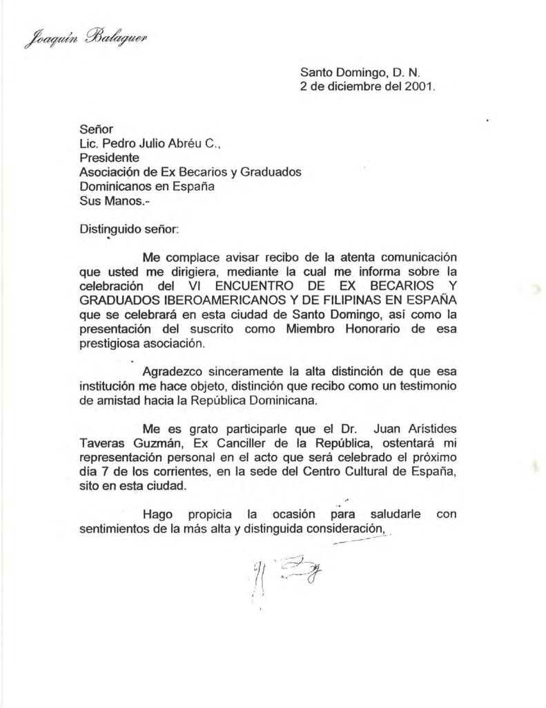 Aquí esta la Carta, que me fue enviada por el Doctor Joaquín Balaguer, anexa.