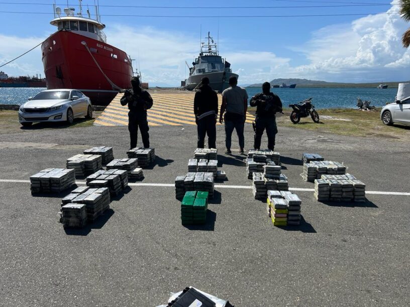 Al asegurar la embarcación a varias millas náuticas al sur de Punta Salinas, municipio de Baní, provincia Peravia, se arrestaron a dos dominicanos y se incautaron 18 sacos con los 565 paquetes de la sustancia, envueltos en cinta adhesiva.