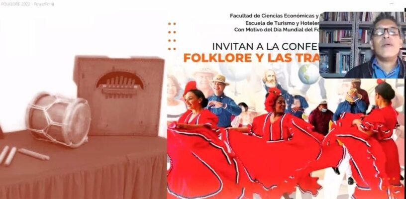 La conferencia Folklore y las Tradiciones, fue organizada por la Escuela de Turismo y Hotelería, de la Facultad de Ciencias Económicas y Sociales, y su directora, la maestra Dorka Alcántara hizo la presentación del conferencista, Edis Sánchez, al público que participó a través de la plataforma virtual.
