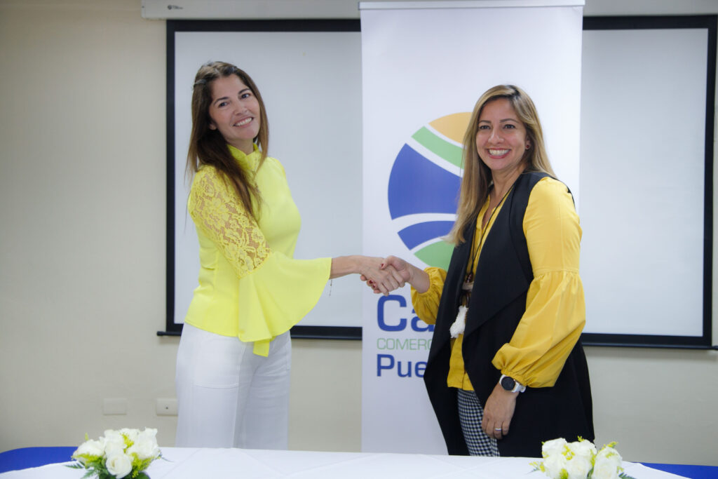 Mileyka Brugal, presidenta de la Cámara de Comercio y Producción de Puerto Plata, y Frindy Martínez Vela, presidente de FUNTUEPP, en el momento de la firma.