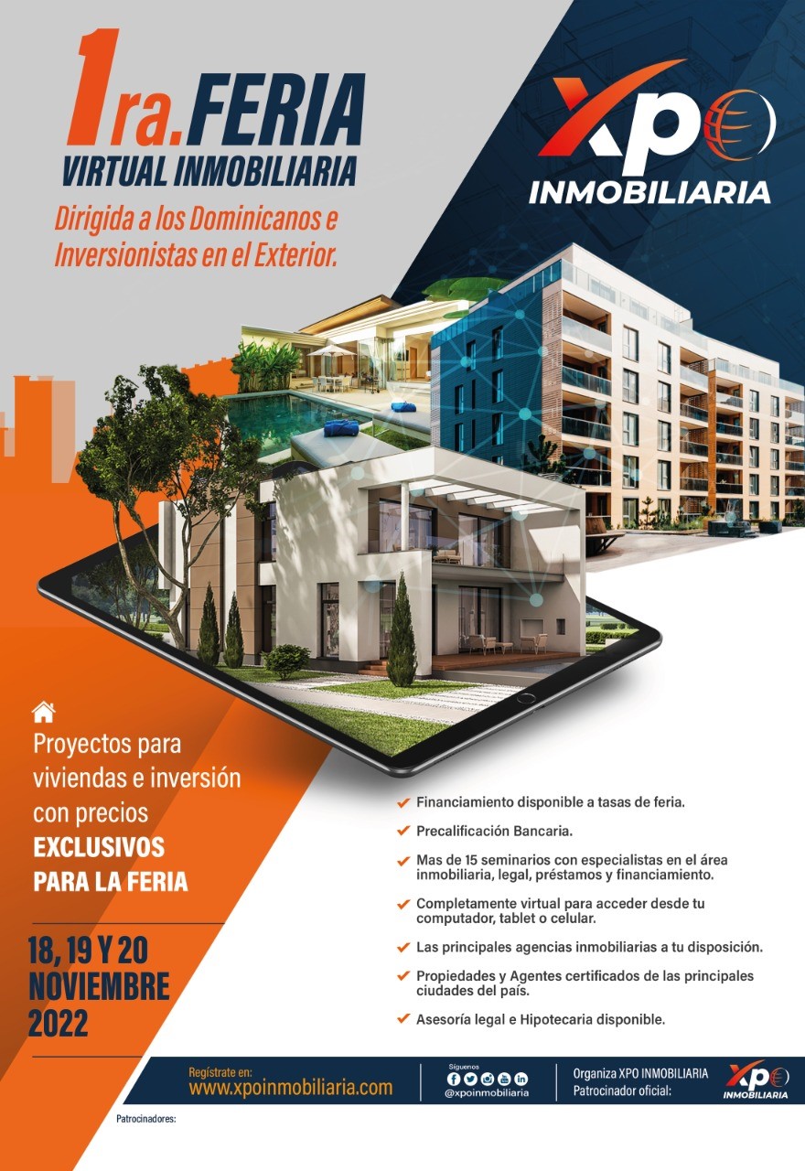 La empresa XPO Inmobiliaria, con sede en los Estados Unidos, anunció la celebración de la 1ra Feria Virtual Inmobiliaria, FIDOM-2022, la cual se llevará a cabo los días 18, 19 y 20 de noviembre del presente año. Está dirigida a los dominicanos e inversionistas en el exterior y será completamente virtual.