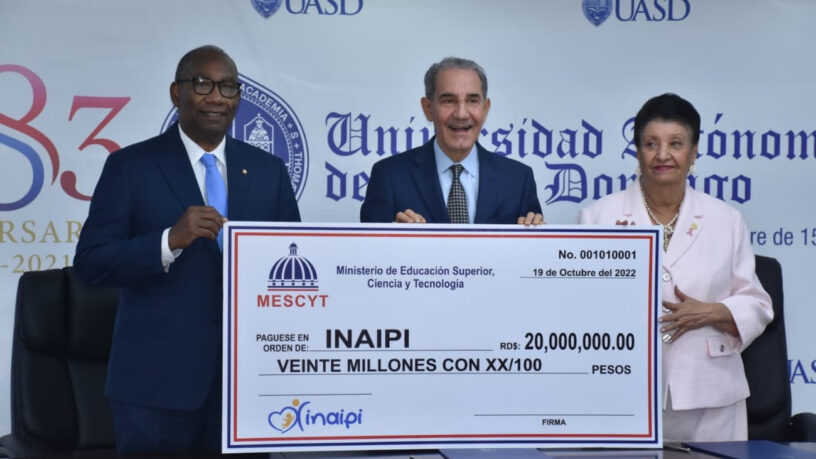 Santo Domingo, R. D., 20 de octubre, 2022.- El Ministerio de Educación Superior, Ciencia y Tecnología (MESCYT) donó RD 20 millones a la Universidad Autónoma de Santo Domingo (UASD) y al Instituto Nacional de Atención Integral a la Primera Infancia (INAIPI), para la apertura y puesta en funcionamiento de siete estancias infantiles en diversos puntos del país.