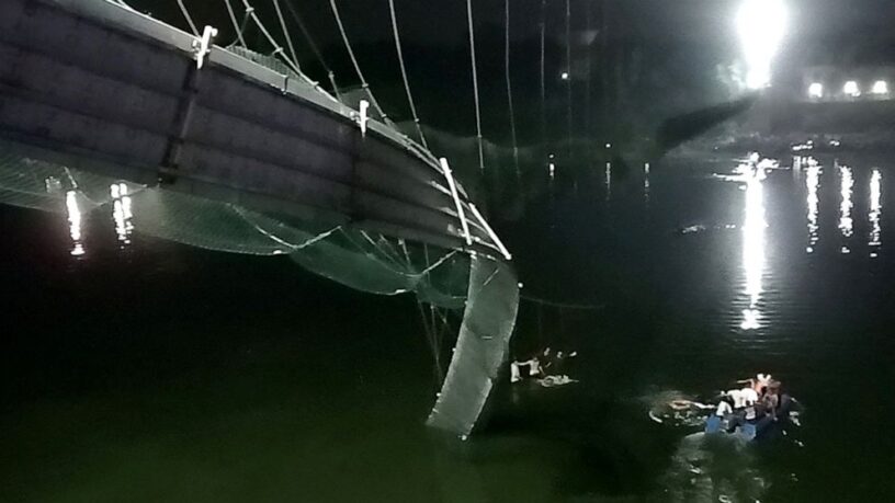 NUEVA DELHI, 30 oct (Xinhua) -- Más de 30 personas murieron y muchas siguen atrapadas en el agua a causa del derrumbe de un puente colgante hoy domingo por la noche en el estado de Gujarat, oeste de India, informaron medios locales. Se teme que aumente la cifra de muertes, dijo un funcionario del Gobierno estatal. "Al menos 32 personas perdieron la vida, mientras que muchas otras resultaron heridas después de que un puente colgante en el distrito Morbi de Gujarat colapsara en el río Machchhu el domingo por la noche", informó India Today. Otros reportes indicaron que más de 400 personas estaban en el puente cuando se derrumbó. El trabajo de socorro y rescate continúa. El puente, que fue reabierto recientemente al público después de una renovación, se derrumbó porque no pudo soportar el peso de las personas que estaban en él, señalaron los reportes. El primer ministro Narendra Modi habló con funcionarios del Gobierno estatal y les dio instrucciones de que proporcionen toda la ayuda posible a los afectados. Fin