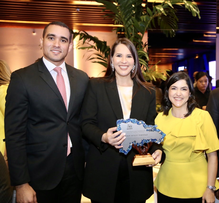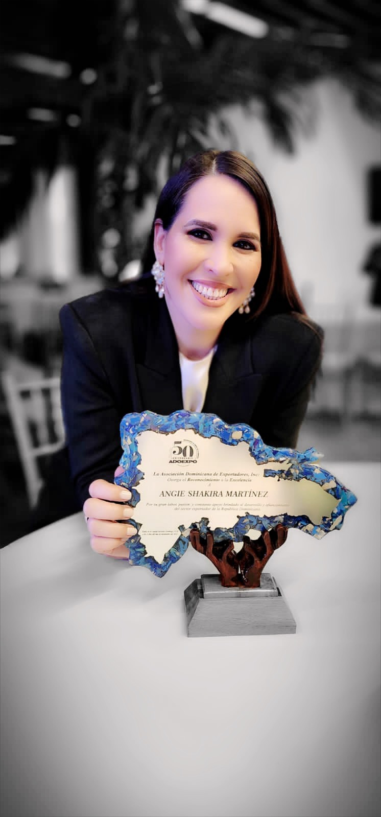«La Asociación Dominicana de Exportadores reconoce a Angie Shakira Martínez Tejera, Embajadora Extraordinaria y Plenipotenciaria de la República Dominicana en Jamaica. Por su liderazgo y demostrado compromiso en dinamizar y seguir fortaleciendo las relaciones comerciales y diplomáticas entre la República Dominicana y Jamaica. Se destaca el crecimiento del 39% en las exportaciones hacia Jamaica durante el año 2021, demostrando la resiliencia del sector exportador dominicano».