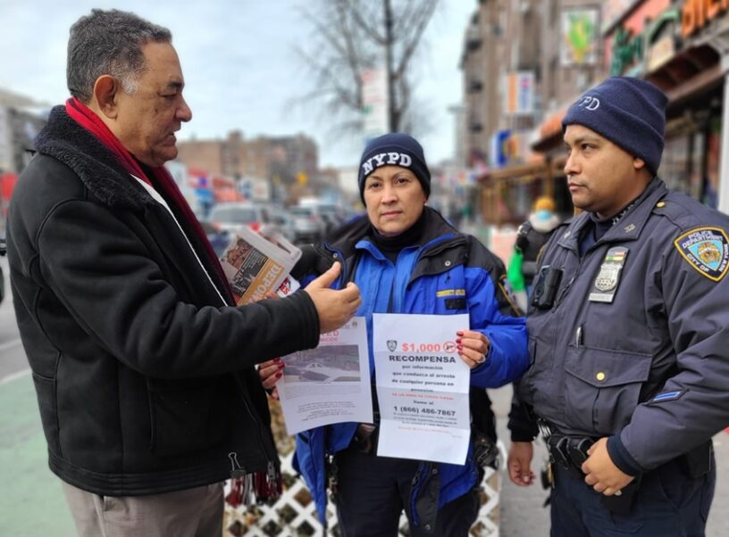 La detective Pabey y el oficial policial Navarrete del precinto 34 están distribuyendo entre la comunidad del Alto Manhattan (restaurantes, bodegas, tiendas, supermercados, y de manera personal) los afiches que contienen la información sobre lo expuesto arriba. A este reportero les entregaron los mismos.