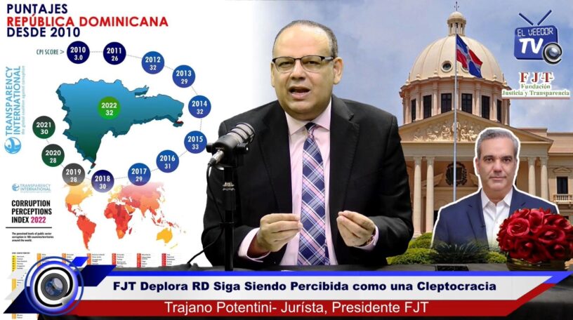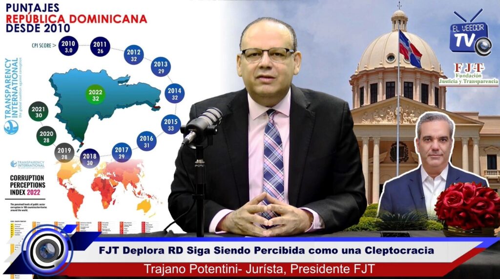 Santo Domingo, Rep. Dom., 1 de Febrero del 2023.- El presidente de la Fundación Justicia y Transparencia (FJT),Trajano Potentini, deploró que República Dominicana continúe siendo percibida como una especie de Cleptocracia a nivel internacional, caracterizada como una nación, donde prácticamente y de forma institucionalizada, se sustraen fondos y bienes públicos, por parte de las élites gubernamentales, predominando el tráfico de influencia, el clientelismo, nepotismo y lo peor aún, bajo el manto de la impunidad y complicidad de autoridades, políticos y empresarios.