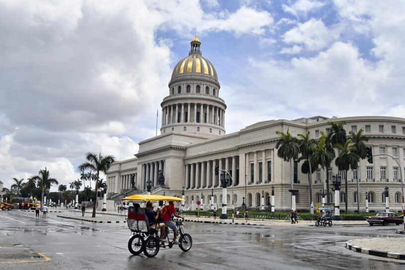 Un bicitaxi circula por una avenida frente al Capitolio, en La Habana, capital de Cuba, el 6 de junio de 2022. (Xinhua/Joaquín Hernández)