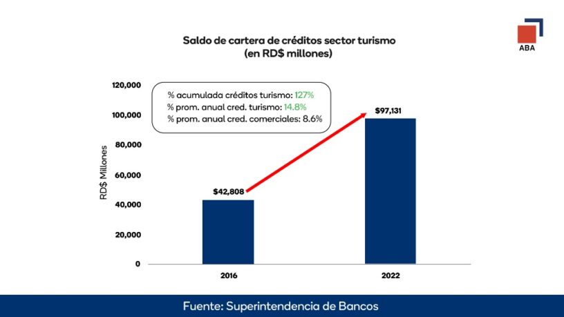 Santo Domingo, Rep. Dom.- Durante los últimos seis años, la cartera de crédito de los bancos múltiples destinada al turismo registró una expansión de 127%, al pasar de RD$42,808 millones en 2016 a RD$97,131 millones en 2022, para un incremento acumulado de RD$54,324 millones, reveló la Asociación de Bancos Múltiples de la República Dominicana (ABA).