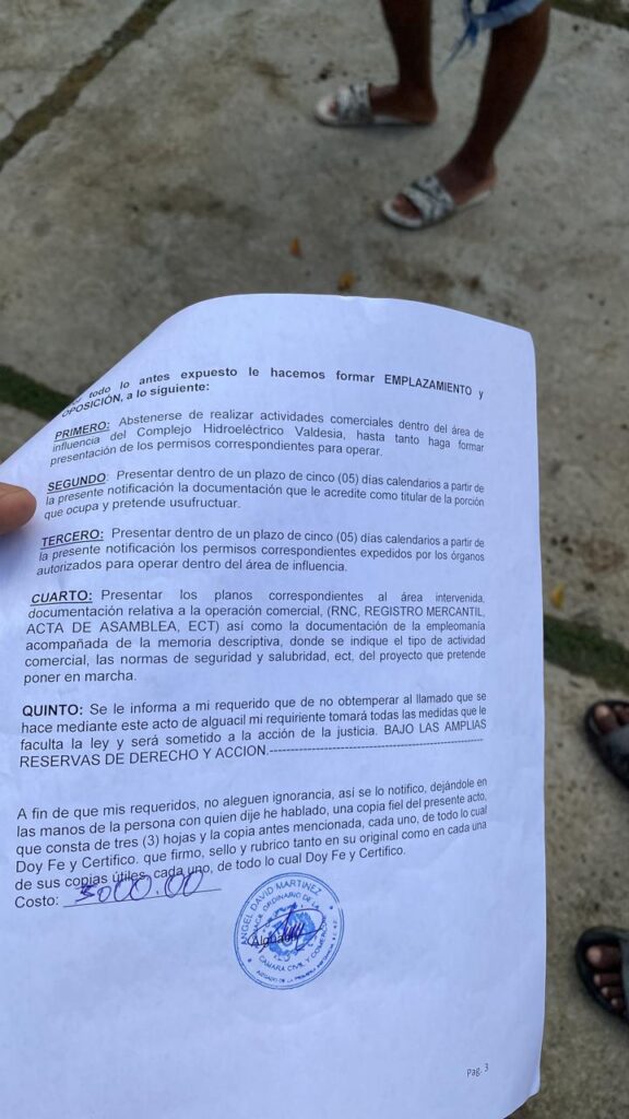 Según el acto de alguacil se alega violación al Decreto 571-09 que establece “límite para resguardar la estructura de la presa de Valdesia”, sin embargo en otros lagos y presas existen otros negocios que funcionan sin ser un peligro para las presas.