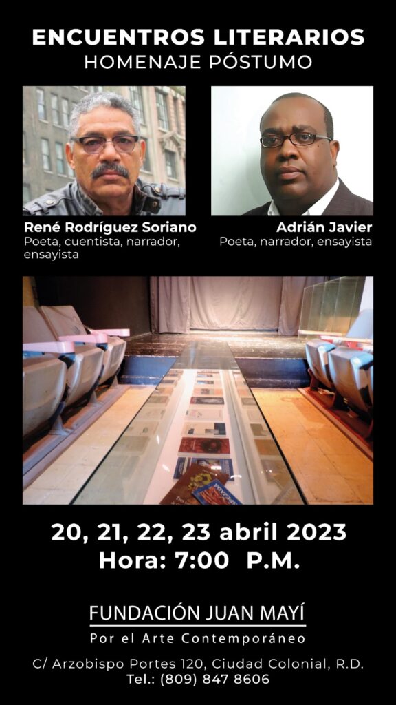 La Fundación Juan Mayí, por el Arte Contemporáneo retoma sus Encuentros Literarios con un homenaje a los escritores y poetas dominicanos René Rodríguez Soriano (1950-2020), poeta, narrador, cuentista, ensayista y Adrián Javier (1967-2013 ) poeta, narrador y ensayista.