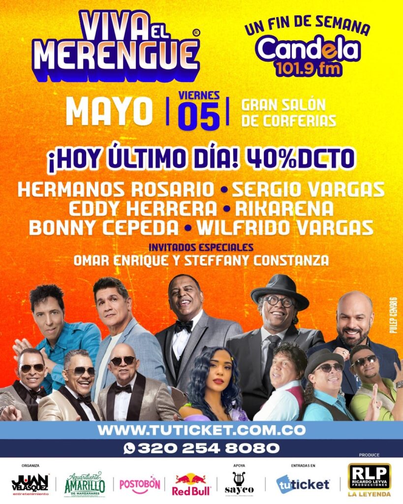 El megaconcierto Viva el Merengue será el viernes 5 de mayo en el majestuoso salón de CORFERIAS, donde se registrará otra noche histórica para este candente ritmo caribeño.