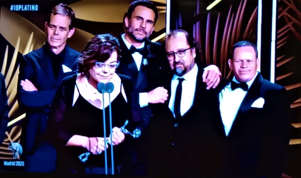 El equipo que produjo la teleserie «Noticias de un secuestro», agradece su Premio Platino.