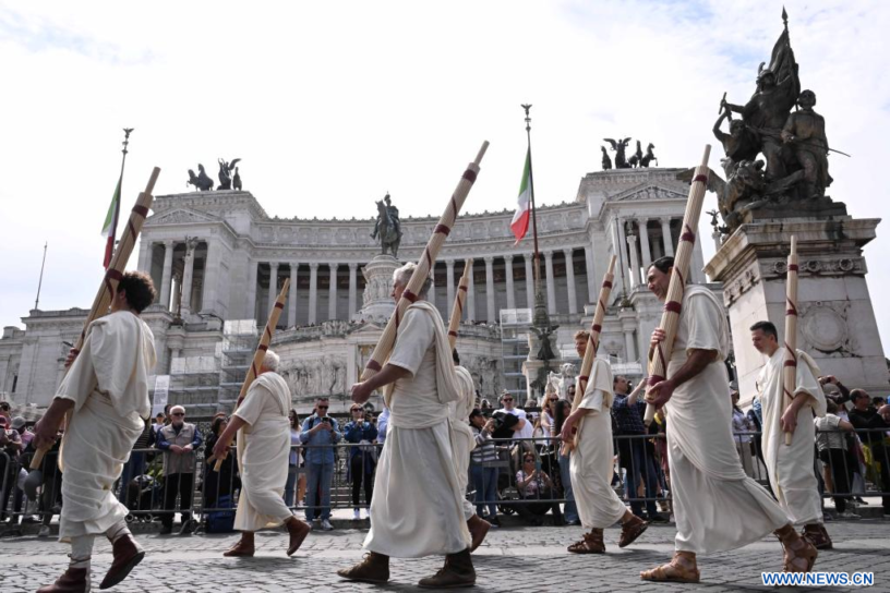 ROMA, 23 abril, 2023 (Xinhua) — Artistas participan en un desfile para celebrar el cumpleaños número 2.776 de Roma, en Roma, capital de Italia, el 23 de abril de 2023. La ciudad de Roma cumplió 2.776 años el viernes después de su fundación por Rómulo el 21 de abril de 753 a.C. (Xinhua/Alberto Lingria)