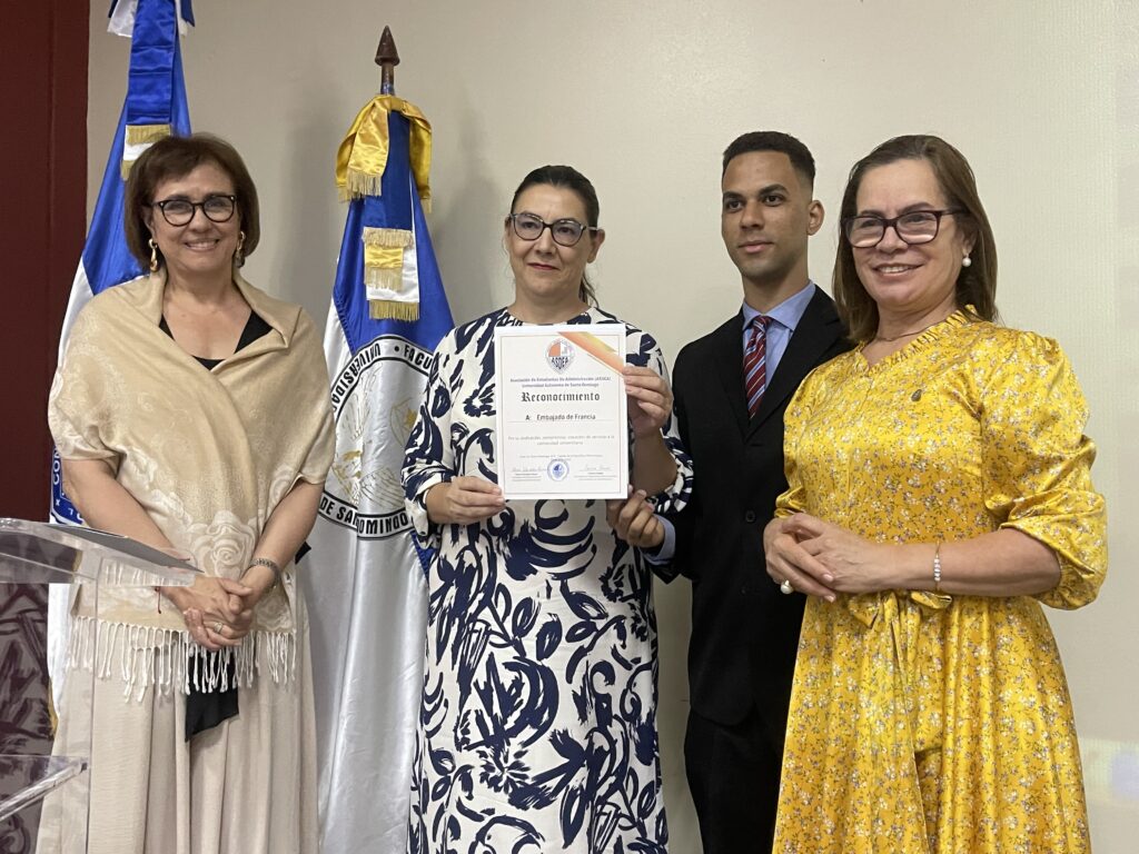 Mientras que el presidente de la Asociación de Estudiantes de Administración y representante estudiantil en el Consejo Universitario, Steven González Rivera, entregó sendos pergaminos de reconocimientos a la Embajada de Francia, así como a Benger, por su extraordinario trabajo en el montaje del cine francés en la Universidad Autónoma de Santo Domingo.
