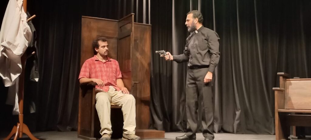 José Roberto Jovany Pepín (Dante) y José Roberto Diaz (Padre Pedro)) en una escena del montaje realizado en Teatro Lope de Vega, emprendimiento de Gianny Paulino en Novo Centro.