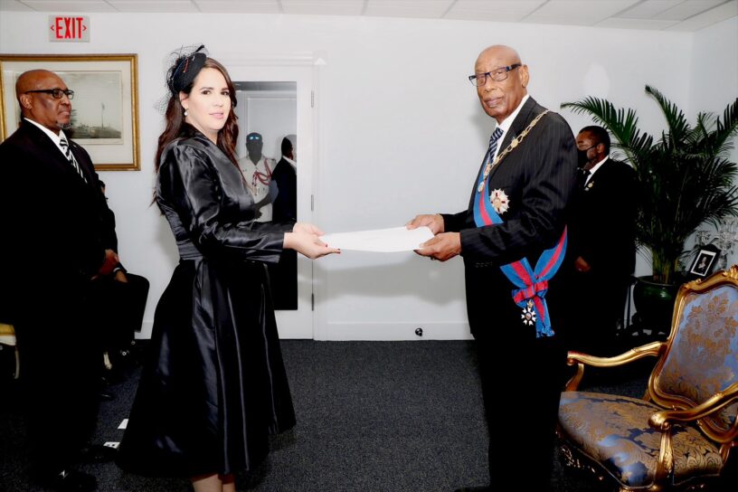 Angie Martínez, presentó oficialmente sus Cartas Credenciales al Gobernador de la Mancomunidad de Las Bahamas, Su Excelencia Sir Cornelius Alvin Smith, representante del Rey de Inglaterra, Su Majestad, Carlos III{