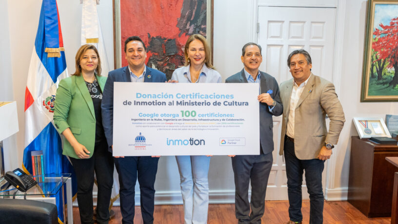 Santo Domingo, R. D., 9 de junio, 2023.- El Ministerio de Cultura recibió una donación de 100 certificaciones por parte de Inmotion en coordinación con Google, como aporte de esas dos empresas para potenciar el desarrollo cultural del país, y fortalecer la formación de profesionales y técnicos en áreas vinculadas a la tecnología e innovación.