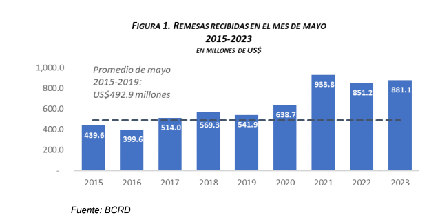 Las remesas recibidas durante el mes de mayo de 2023 sumaron US$881.1 millones, registrando´un crecimiento de 3.5 % respecto al mismo mes de 2022, marcando el quinto mes con incremento en lo que va de año.
