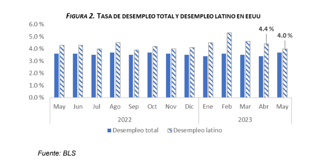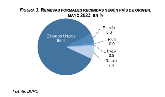 El BCRD explica que el desempeño económico de los Estados Unidos fue uno de los principales factores que incidió sobre el comportamiento de las remesas, ya que desde ese país provino el 5.4 % de los flujos formales de mayo, unos US$679.3 millones. El desempleo general del país norteamericano pasó de 3.4 % en abril a en 3.7 % en mayo; sin embargo, el desempleo de los hispanos descendió de 4.4 % en abril a 4.0 % en mayo. Adicionalmente, el índice de gestores de compras (PMI por sus siglas en inglés) no manufacturero del Instituto de Gerencia y Abastecimiento (ISM por sus siglas en inglés) registró un valor de 50.3 en mayo, indicando una sostenida expansión del sector servicios, donde se emplea la mayor parte de la diáspora dominicana.