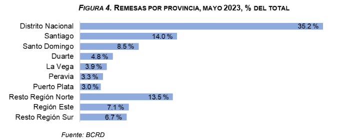 Respecto a la distribución de las remesas recibidas por provincias durante mayo, el BCRD señala que el Distrito Nacional obtuvo la mayor proporción, un 35.2 %, seguido por las provincias Santiago y Santo Domingo, con un 14.0 % y 8.5 %, respectivamente. Esto indica que más de la mitad (57.7 %) de las remesas se recibe en las zonas metropolitanas del país.