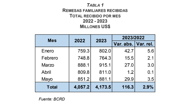 Santo Domingo, RD. El Banco Central de la República Dominicana (BCRD) informa que en los primeros cinco meses del año 2023 las remesas recibidas alcanzaron una cifra de US$4,173.5 millones, exhibiendo un 2.9 % de crecimiento respecto al mismo periodo del año anterior.