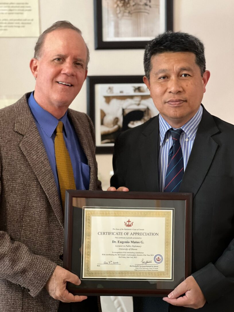 El embajador Kamal Bashah Ahmad, Decano del Cuerpo Diplomático en Canadá, otorgó por segunda ocasión el reconocimiento especial al dominicano Dr. Eugene Matos G., catedrático de diplomacia pública en la Universidad de Ottawa y egresado en leyes de la facultad de derecho de esa institución académica.