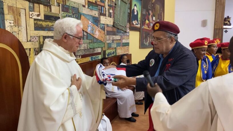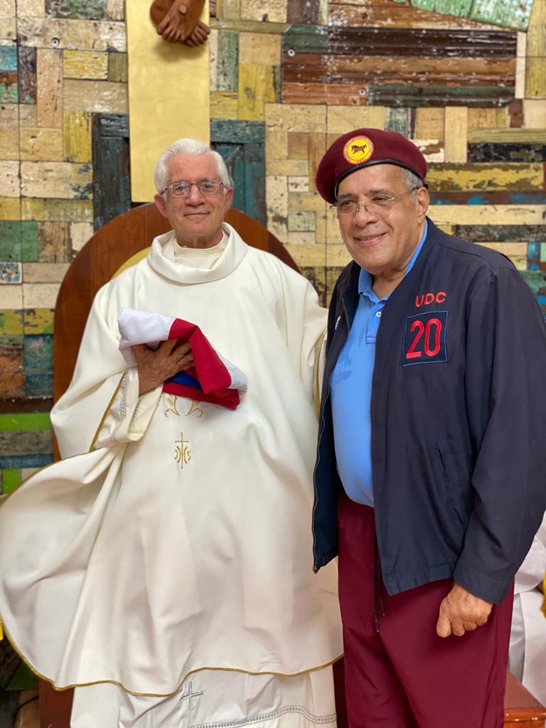 Al final de la misa, Luis “El Gallo” entregó la Bandera Nacional del padre Alegría y pidió mucha salud y larga vida para él, y su ministerio en favor de los pobres.