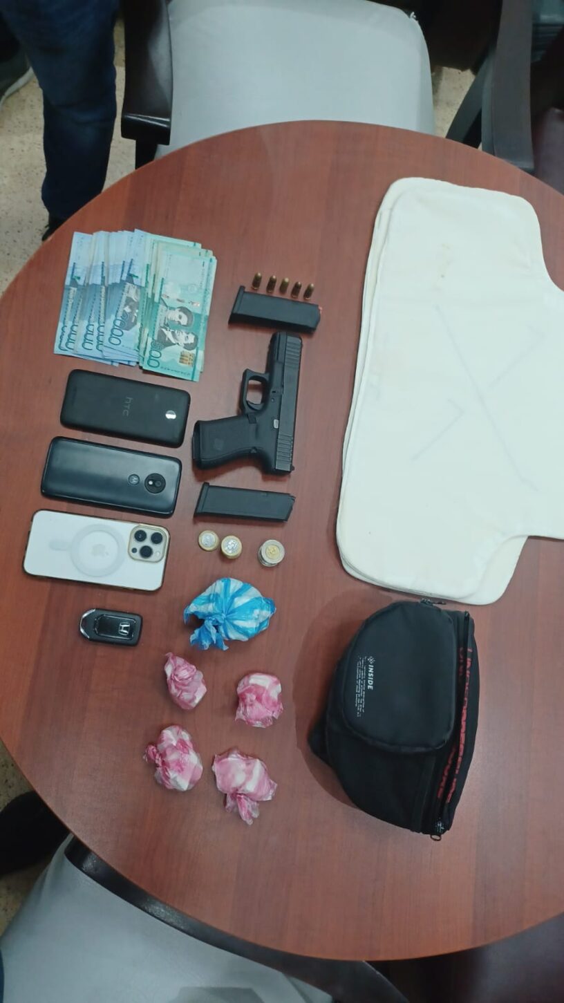 Durante su arresto se le ocupó un arma de fuego con su cargador y varias cápsulas para la misma, varias porciones de un polvo que se presume pueda ser cocaína, tres teléfonos celulares, dinero en efectivo y un chaleco antibalas.