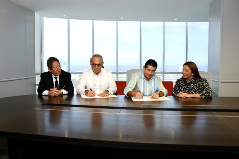 Firman un acuerdo de trabajo, el presidente del comité organizador y cónsul de Barbados, Emilio Hasbún y el presidente de Karisma Hotel, Jorge Feliz Germán. Observan, el decano del Cuerpo Consular, Fernando González y el cónsul de Tailandia, MaríaJosé Turull.