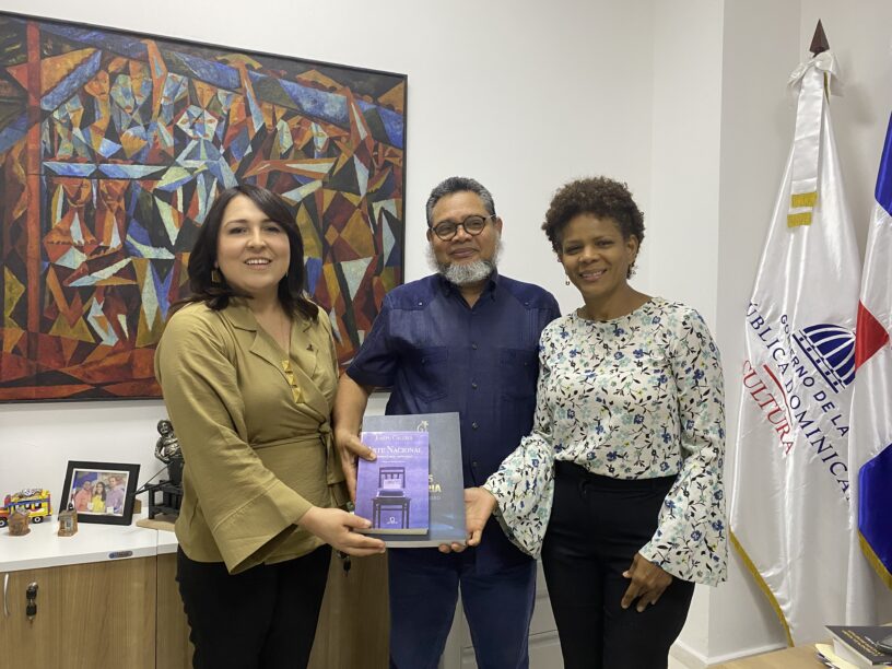 Emelyn Baldera, presidente de Acroarte, entrega las dos obras publicadas por la Editora Acroarte, al director de la Dirección General de Museos, Carlos Andújar, junto a la ex presidente de la institución Marivell Contreras.
