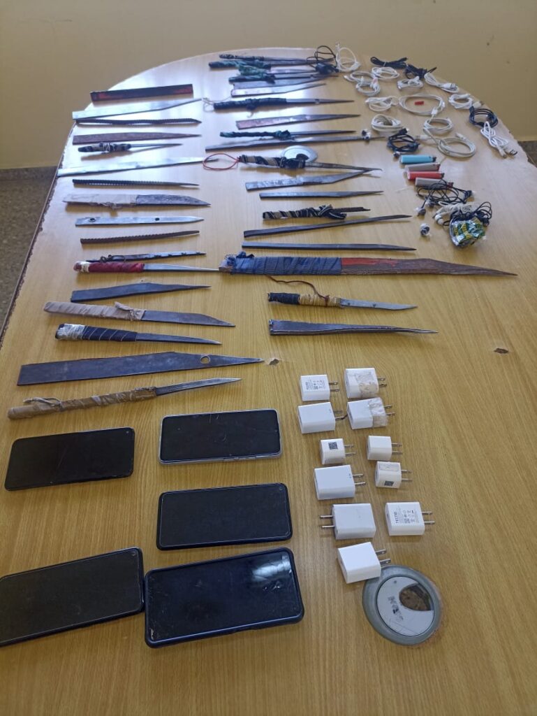 Durante la requisa se ocuparon 36 objetos cortopunzantes, cinco teléfonos celulares, 17 cables USB, una fundita de tabaco y ocho porciones pequeñas, 11 cabeza USB, tres encendedores y tres auriculares con cable.