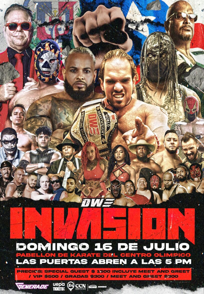 Santo Domingo, República Dominicana – La Dominican Wrestling Entertainment (DWE), regresa a Santo Domingo con su magno evento, INVASION, el domingo 16 de julio, a las 6:00 de la tarde, en el Pabellón de Karate del Centro Olímpico.